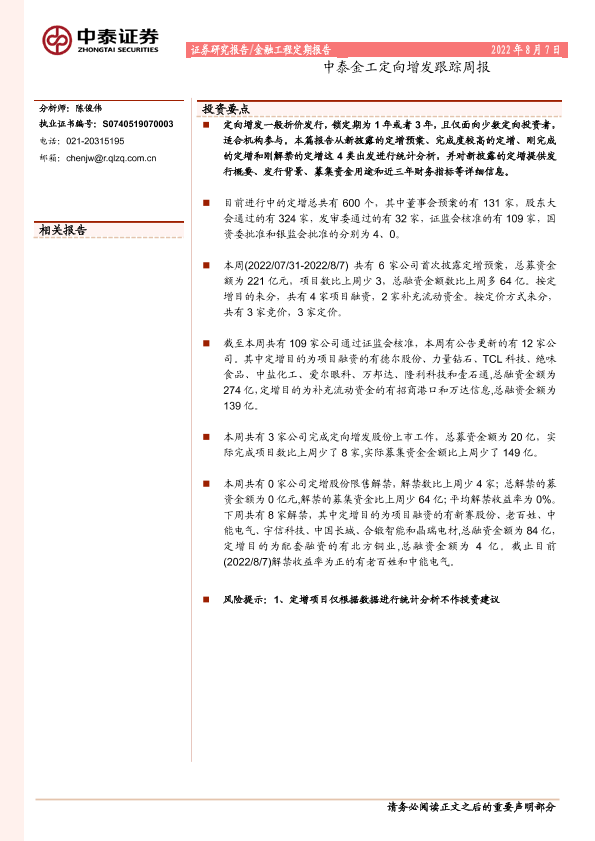 【中泰证券】【20220807】中泰金工定向增发跟踪周报-11页