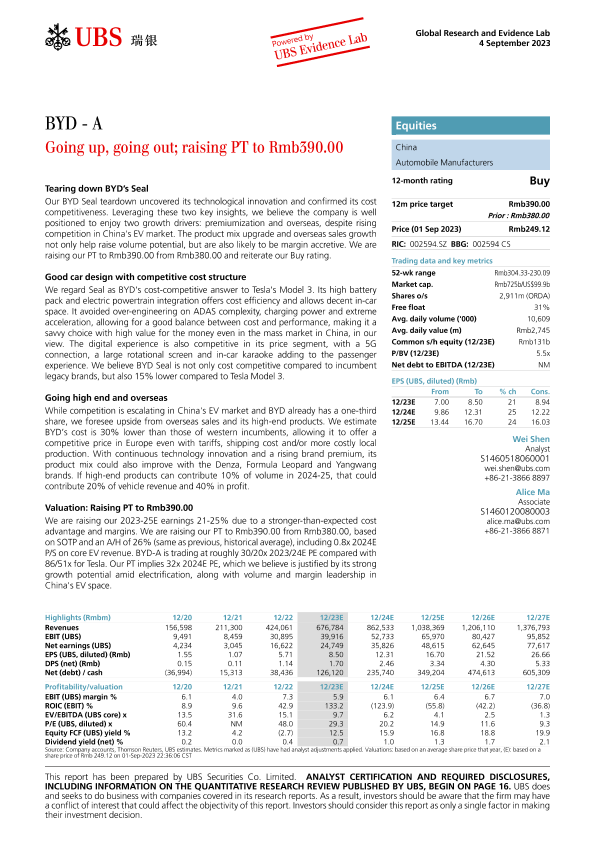 【UBS Securities Co. Limited】【20230904】es-BYD - Going up, going out; raising PT to Rmb390.00 (Buy)-25页