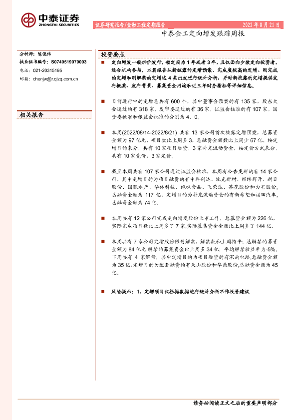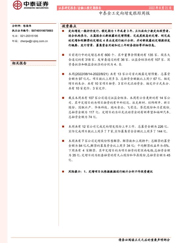 【中泰证券】【20220821】中泰金工定向增发跟踪周报-14页
