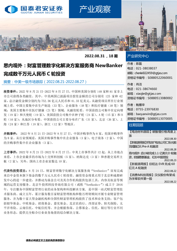 【国泰君安证券】【20220831】产业观察18期:思内观外,财富管理数字化解决方案服务商NewBanker完成数千万元人民币C轮投资-23页