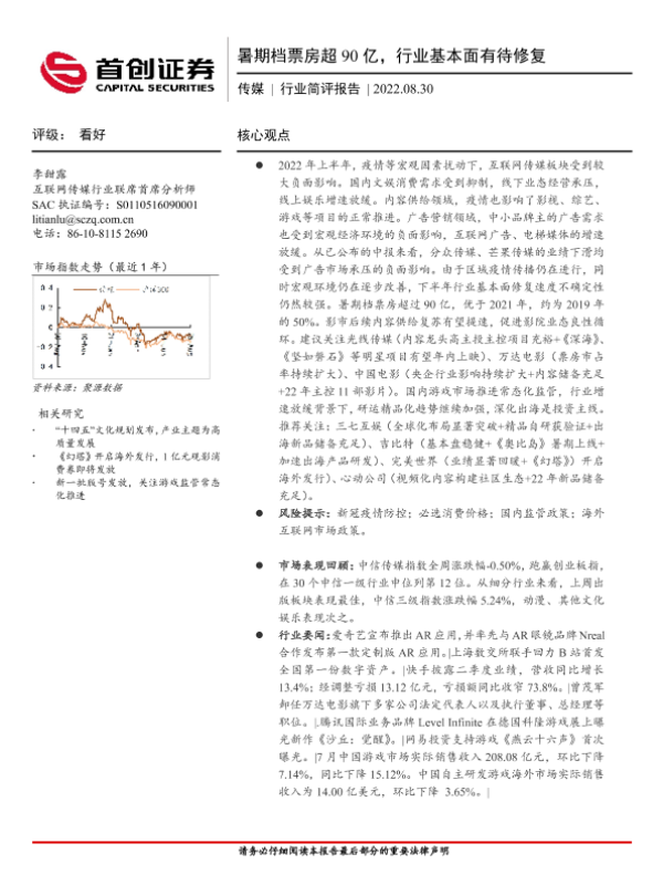 【首创证券】【20220830】传媒行业简评报告:暑期档票房超90亿,行业基本面有待修复-19页