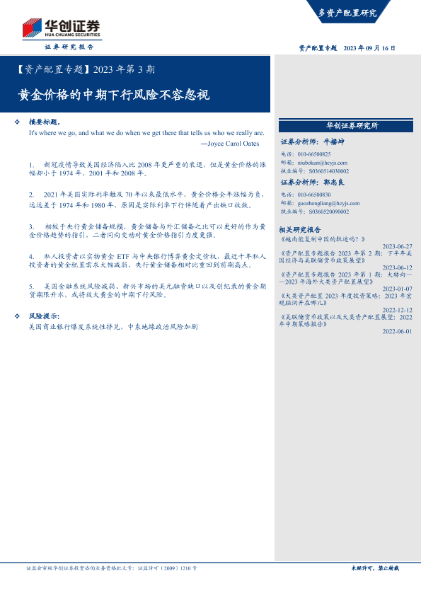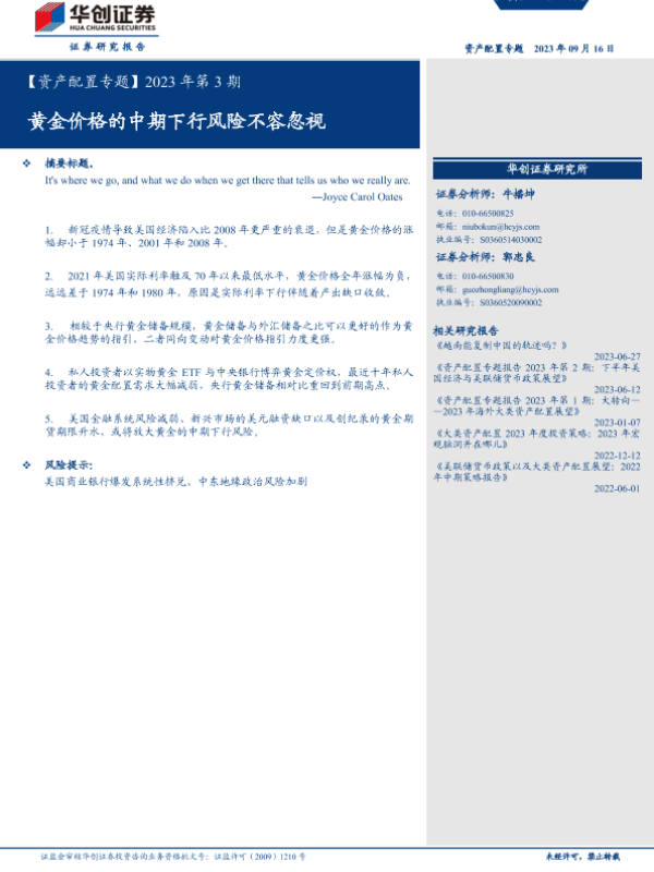【华创证券】【20230916】【资产配置专题】2023年第3期:黄金价格的中期下行风险不容忽视-22页