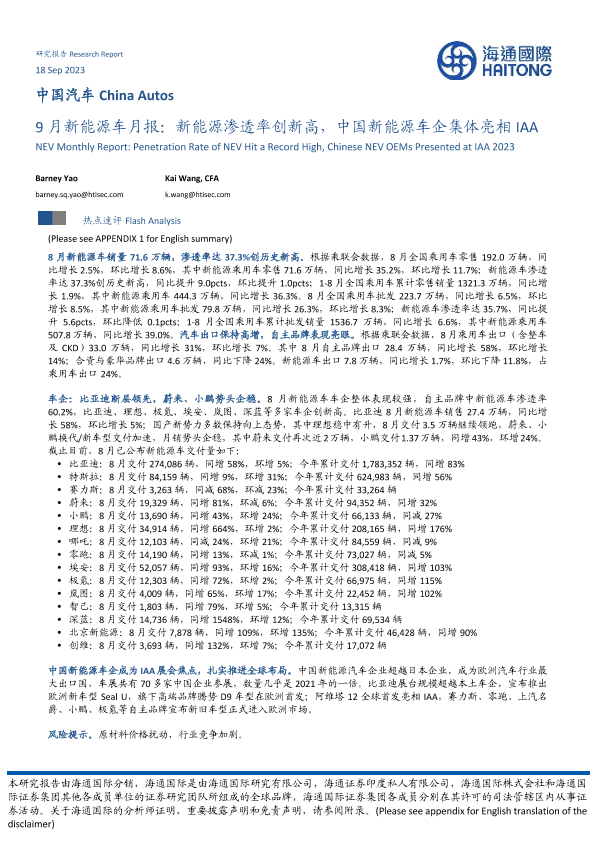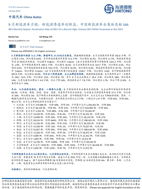 【海通国际】【20230918】9月新能源车行业月报:新能源渗透率创新高,中国新能源车企集体亮相IAA-17页