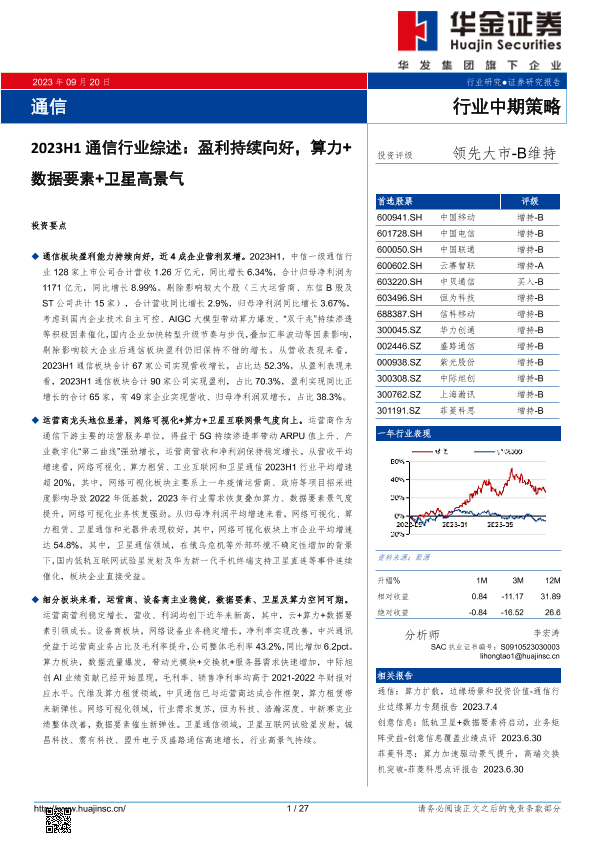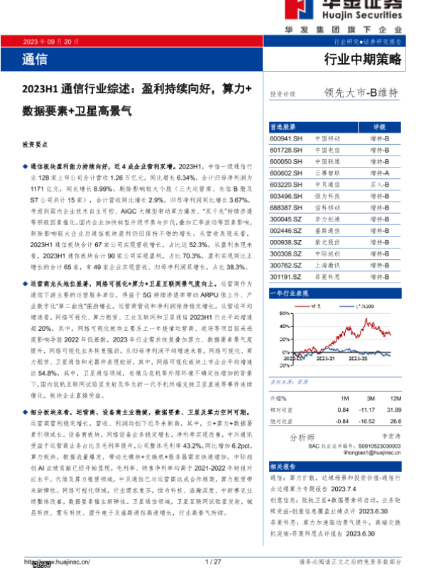 【华金证券】【20230920】2023H1通信行业综述:盈利持续向好,算力+数据要素+卫星高景气-27页