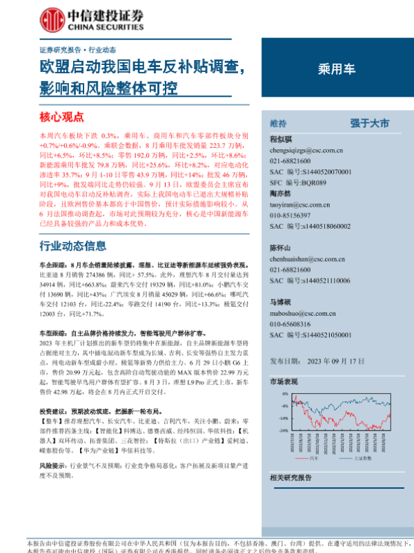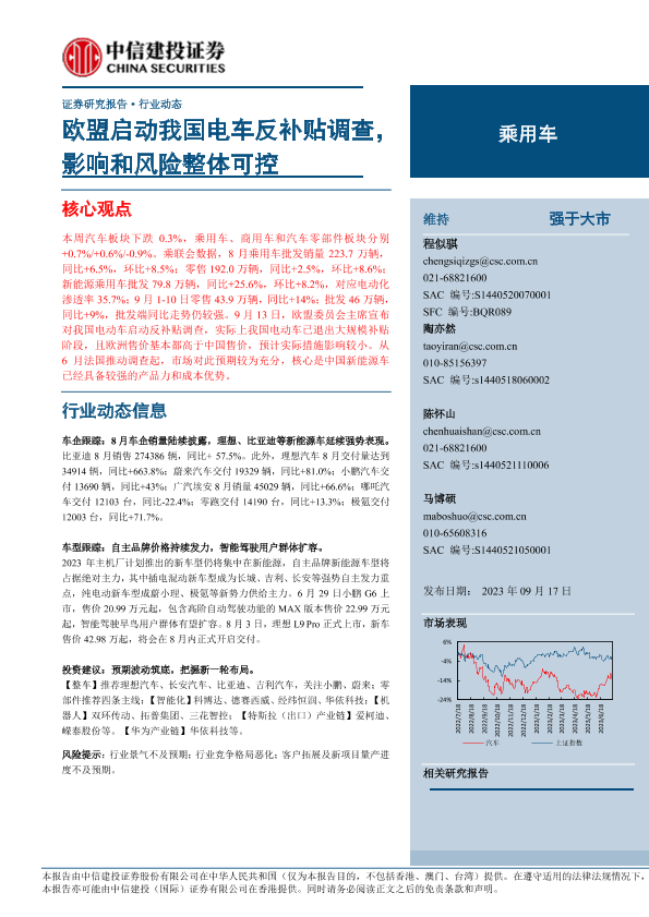 【中信建投证券】【20230917】乘用车行业:欧盟启动我国电车反补贴调查, 影响和风险整体可控-15页