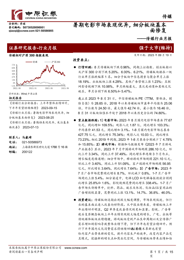【中原证券】【20230919】传媒行业月报:暑期电影市场表现优异,细分板块基本面修复-15页