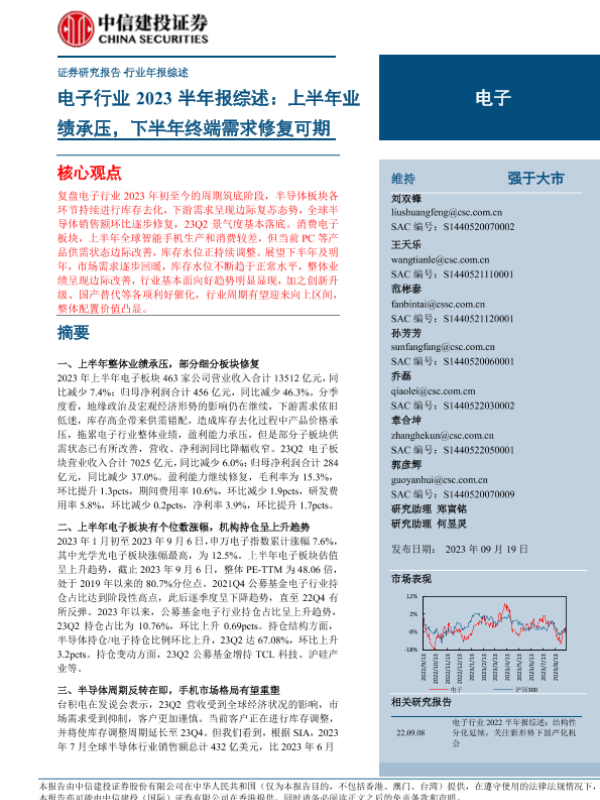【中信建投证券】【20230919】电子行业2023半年报综述:上半年业绩承压,下半年终端需求修复可期-25页