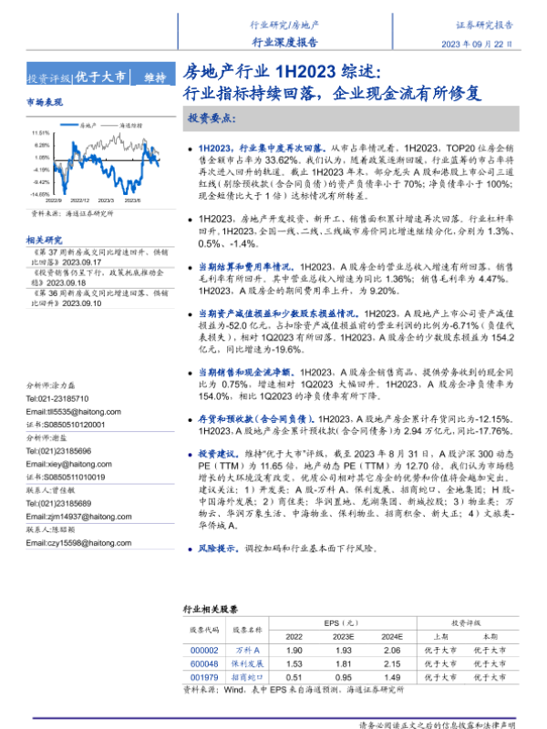 【海通证券】【20230922】房地产行业1H2023综述:行业指标持续回落,企业现金流有所修复-27页