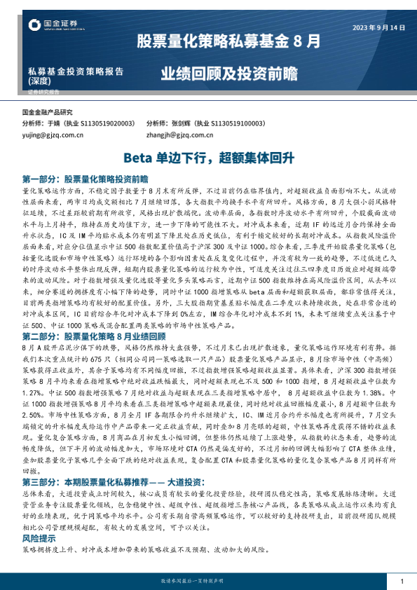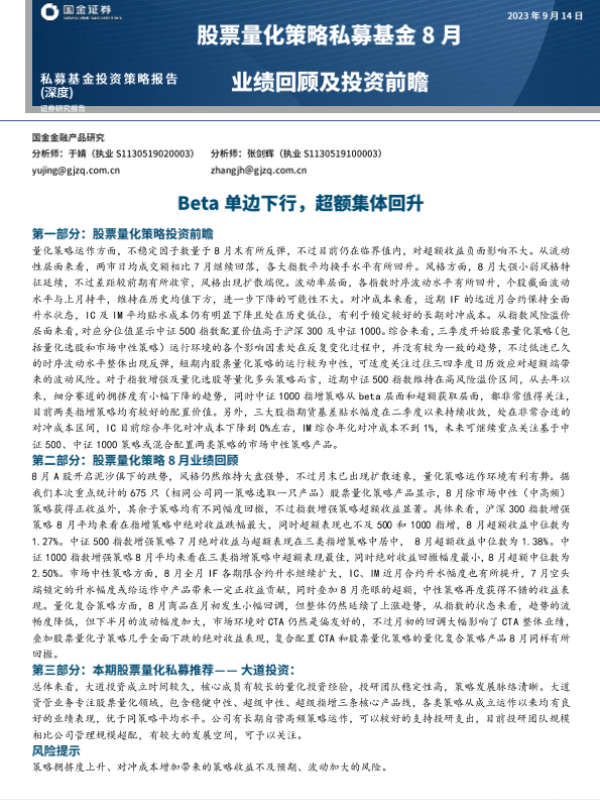 【国金证券】【20230914】股票量化策略私募基金8月业绩回顾及投资前瞻:Beta单边下行,超额集体回升-19页