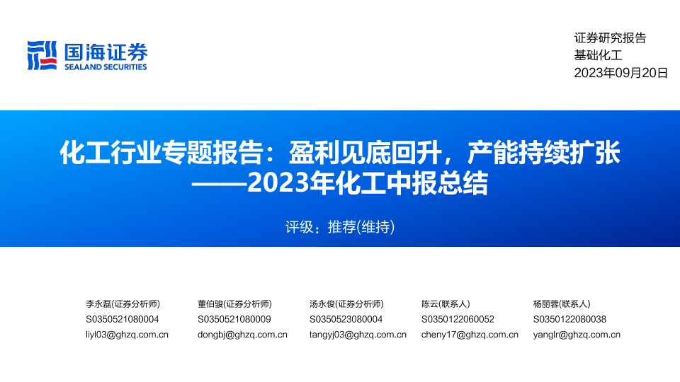 【国海证券】【20230920】化工行业专题报告:2023年化工中报总结,盈利见底回升,产能持续扩张-55页