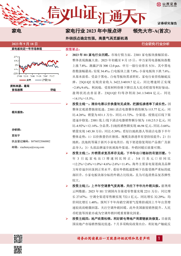 【山西证券】【20230918】家电行业2023年中报点评:外销拐点确定性强,高景气再觅新机遇-33页