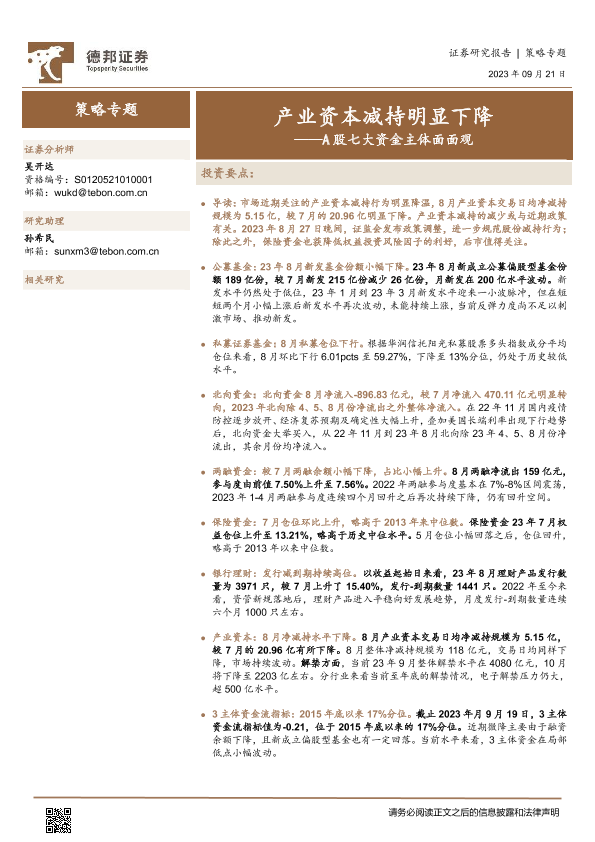 【德邦证券】【20230921】A股七大资金主体面面观:产业资本减持明显下降-21页