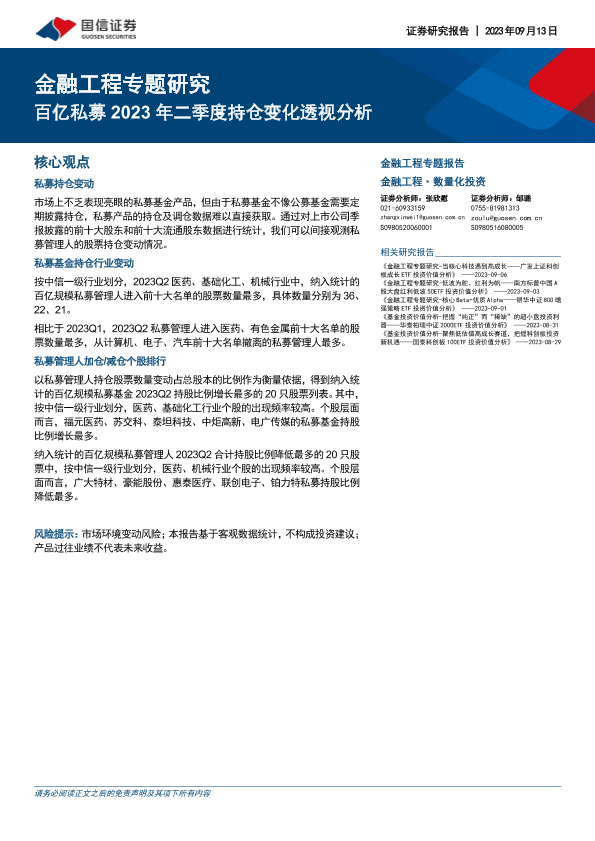 【国信证券】【20230913】金融工程专题研究:百亿私募2023年二季度持仓变化透视分析-16页