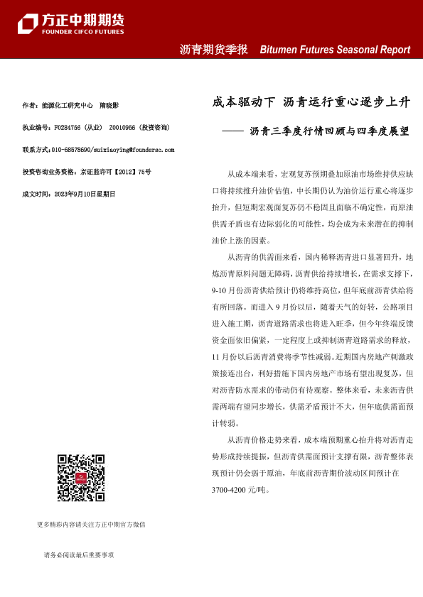 【方正中期期货】【20230910】成本驱动下沥青运行重心逐步上升——沥青三季度行情回顾与四季度展望-16页