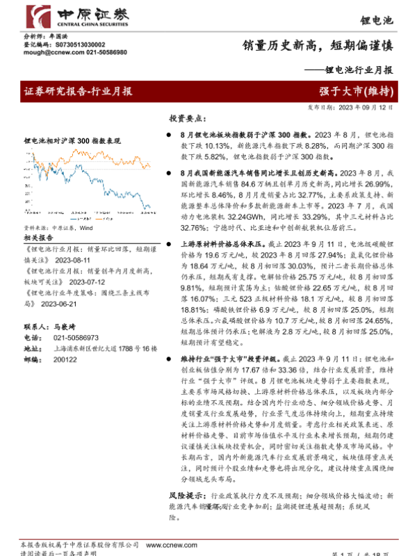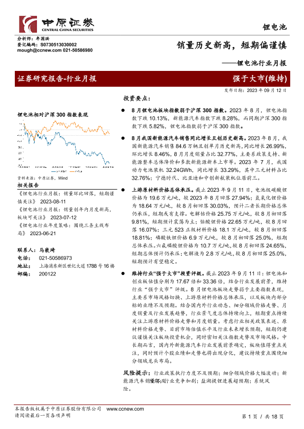【中原证券】【20230912】锂电池行业月报:销量历史新高,短期偏谨慎-18页