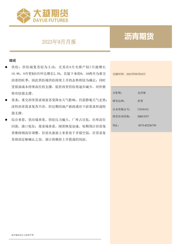 【大越期货】【20230905】沥青期货2023年9月月报-16页