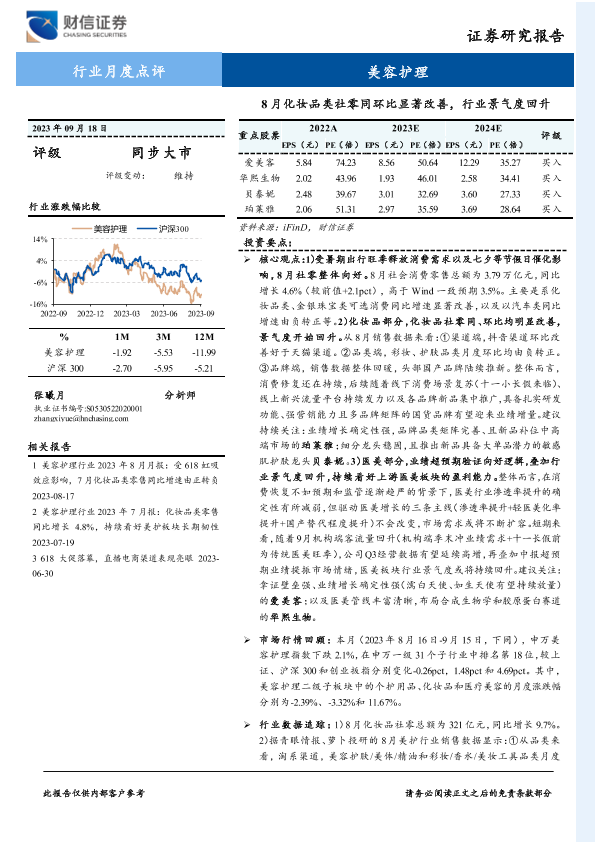 【财信证券】【20230918】美容护理行业月度点评:8月化妆品类社零同环比显著改善,行业景气度回升-15页