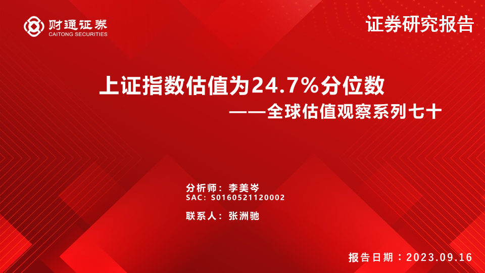 【财通证券】【20230916】全球估值观察系列七十:上证指数估值为24.7%分位数-29页