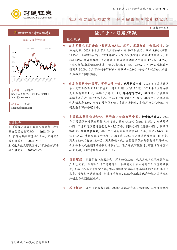 【财通证券】【20230912】轻工制造行业轻工出口月度跟踪:家具出口额降幅收窄,地产回暖或支撑出口需求-16页