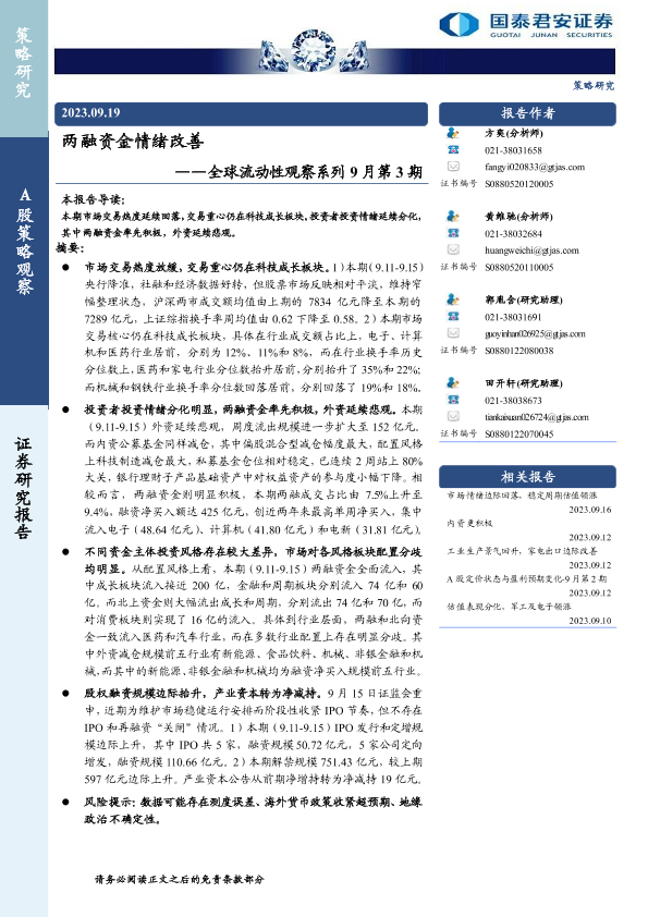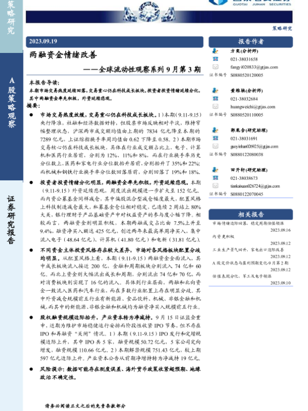 【国泰君安证券】【20230919】全球流动性观察系列9月第3期:两融资金情绪改善-26页