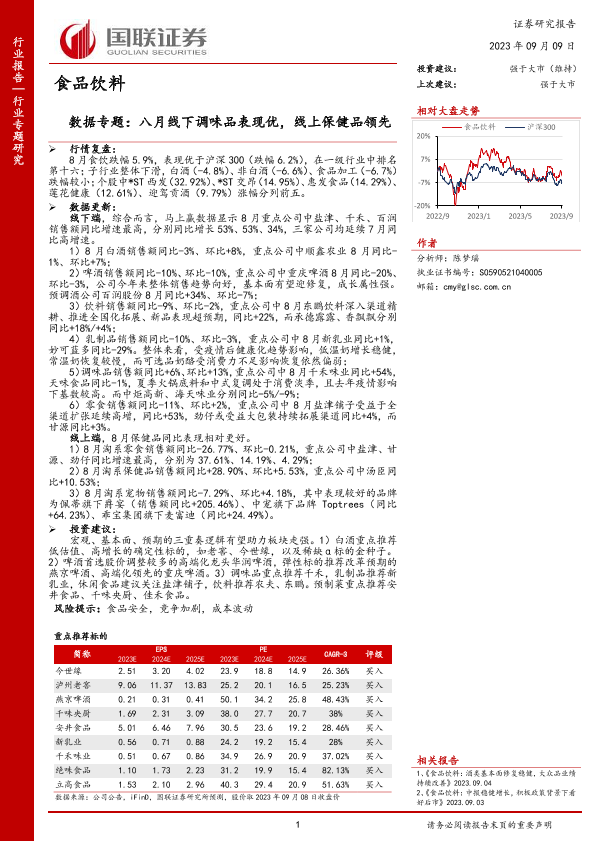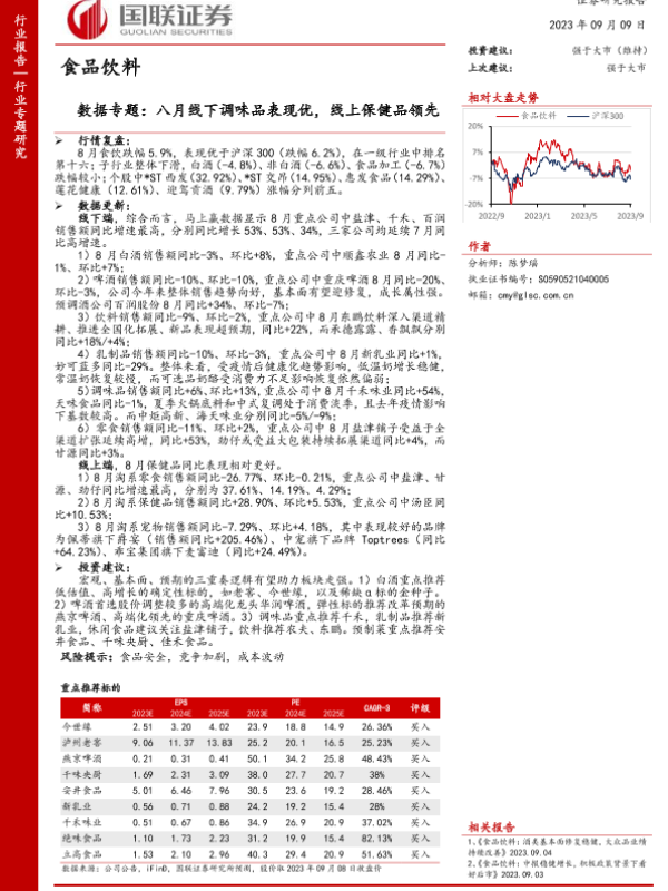 【国联证券】【20230909】食品饮料行业数据专题:八月线下调味品表现优,线上保健品领先-18页