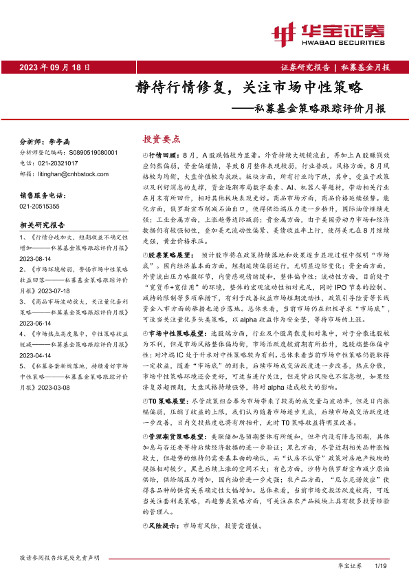 【华宝证券】【20230918】私募基金策略跟踪评价月报:静待行情修复,关注市场中性策略-19页