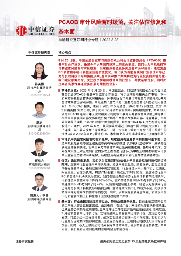 【中信证券】【20220828】前瞻研究互联网行业专题:PCAOB审计风险暂时缓解,关注估值修复和基本面-16页