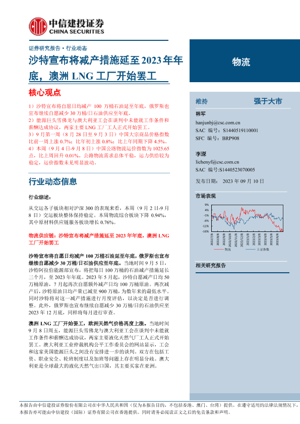 【中信建投证券】【20230910】物流行业:沙特宣布将减产措施延至2023年年底,澳洲LNG工厂开始罢工-16页