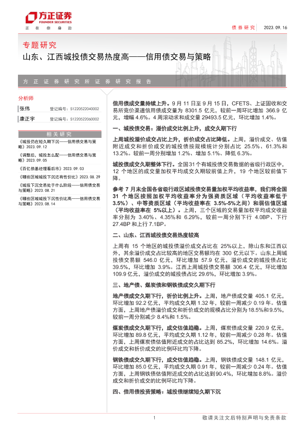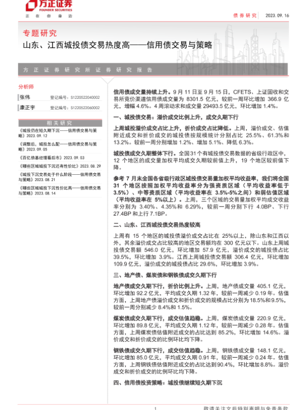 【方正证券】【20230916】信用债交易与策略:山东、江西城投债交易热度高-16页