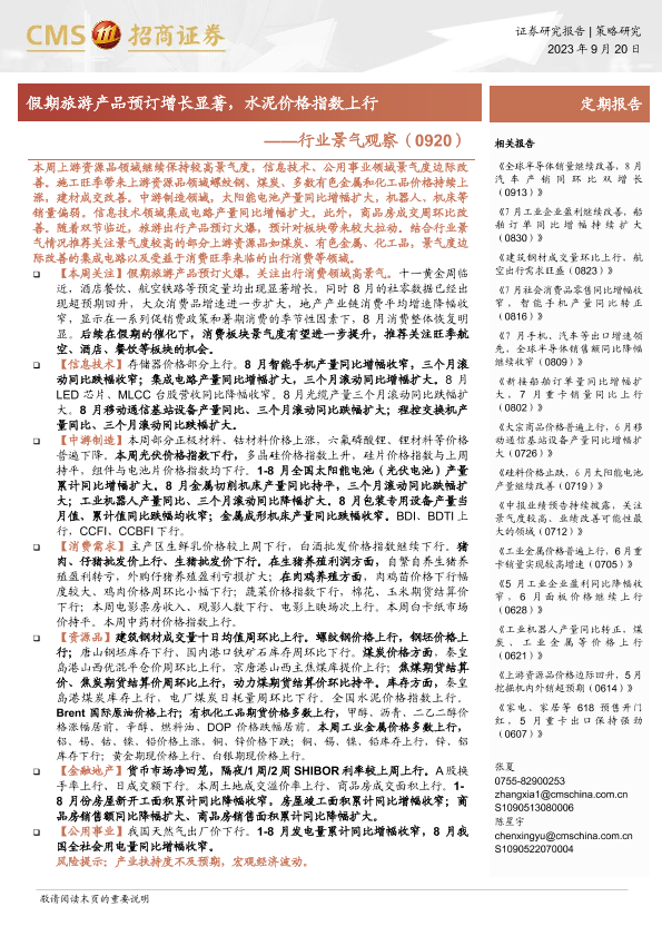 【海通证券】【20230920】行业景气观察:假期旅游产品预订增长显著,水泥价格指数上行-34页