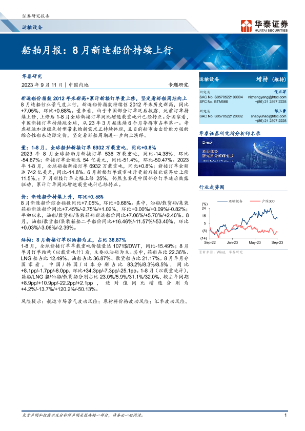 【华泰证券】【20230911】运输设备行业专题研究:船舶月报,8月新造船价持续上行-15页