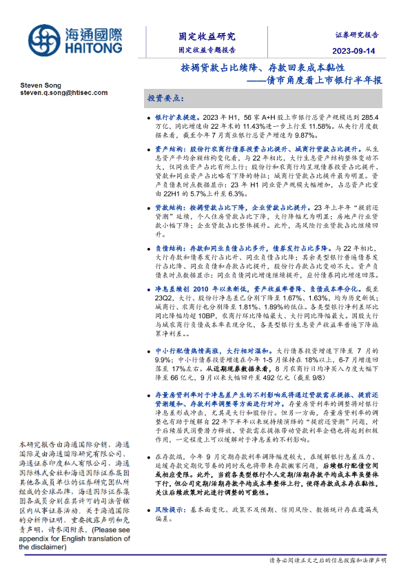 【海通国际】【20230914】按揭贷款占比续降、存款回表成本黏性 ——债市角度看上市银行半年报-19页