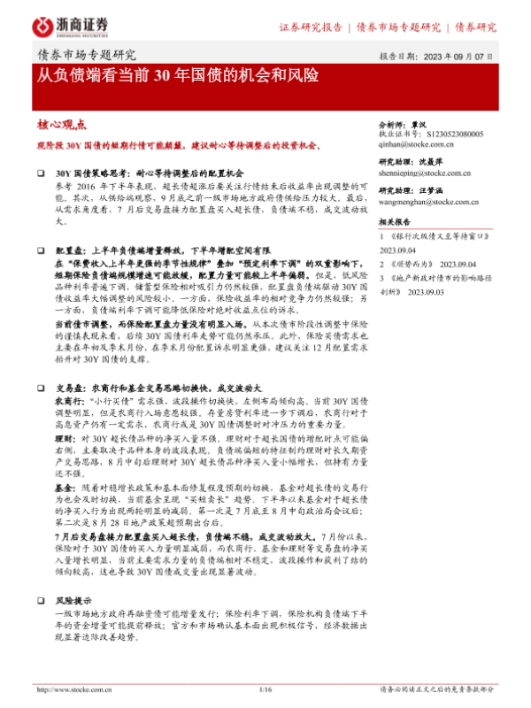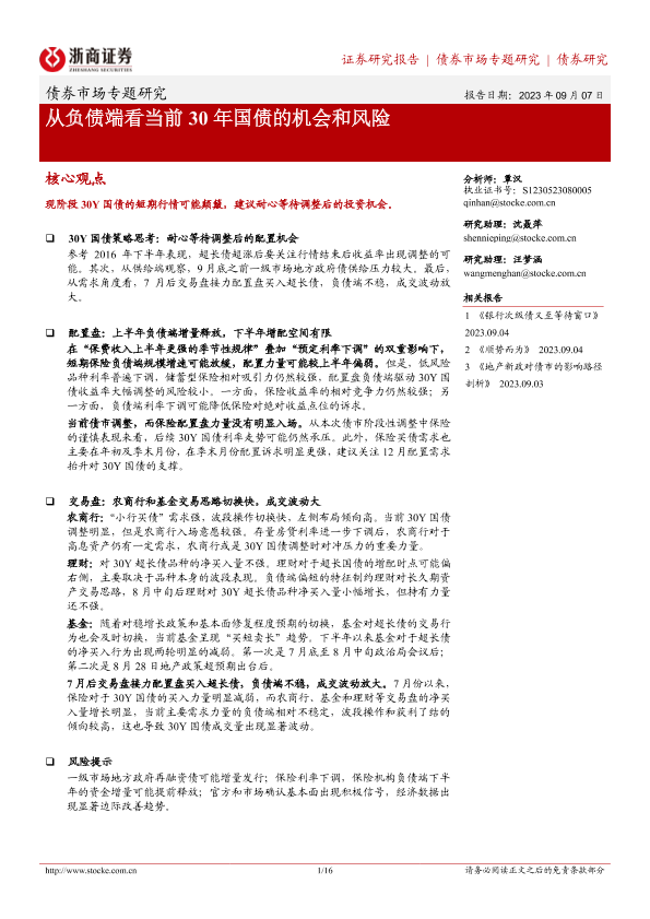 【浙商证券】【20230907】债券市场专题研究:从负债端看当前30年国债的机会和风险-16页