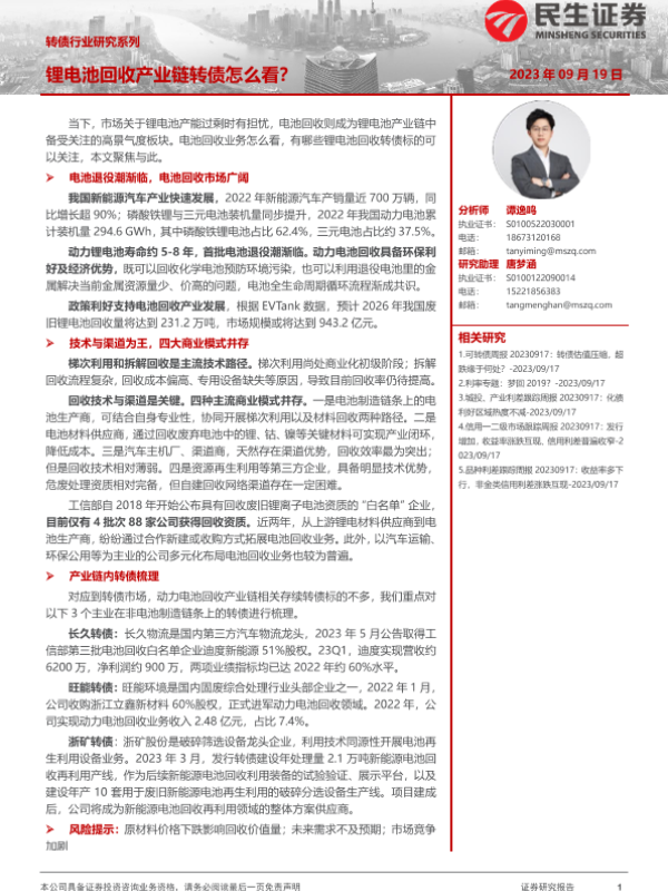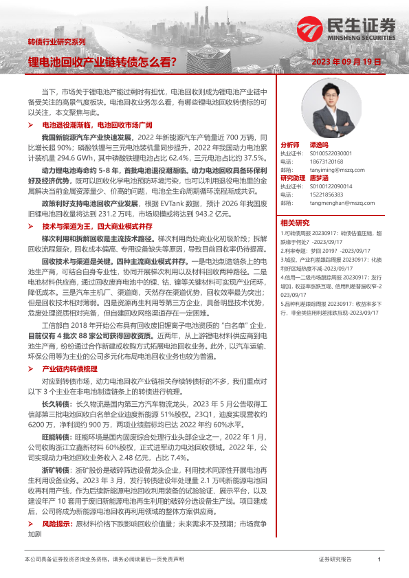 【民生证券】【20230919】转债行业研究系列:锂电池回收产业链转债怎么看?-21页