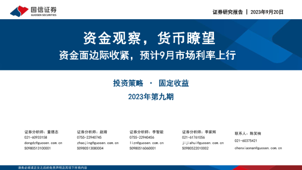 【国信证券】【20230920】资金观察,货币瞭望:资金面边际收紧,预计9月市场利率上行-28页