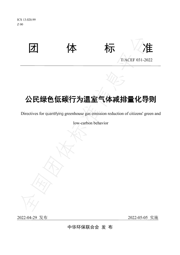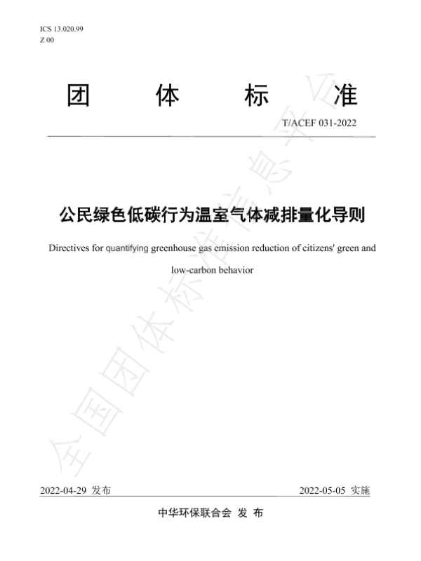 团体标准 温室气体减排 环境保护 绿色低碳行为 量化导则