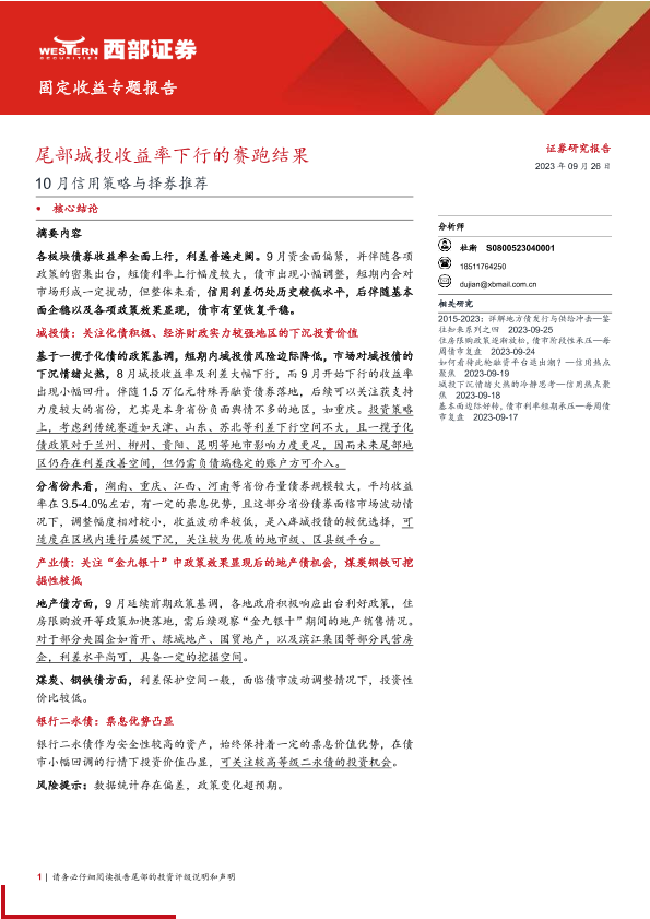 【西部证券】【20230926】10月信用策略与择券推荐:尾部城投收益率下行的赛跑结果-19页