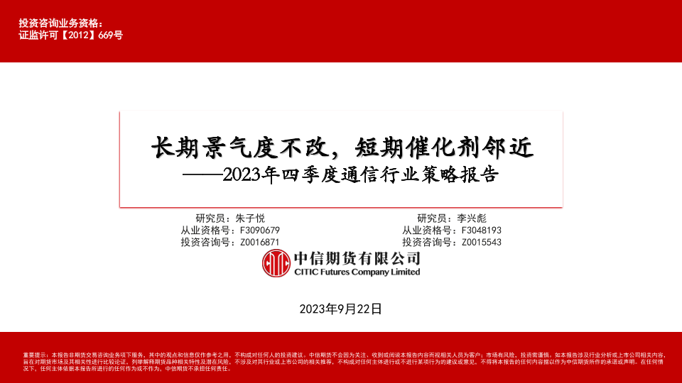 【中信期货】【20230922】2023年四季度通信行业策略报告:长期景气度不改,短期催化剂邻近-26页