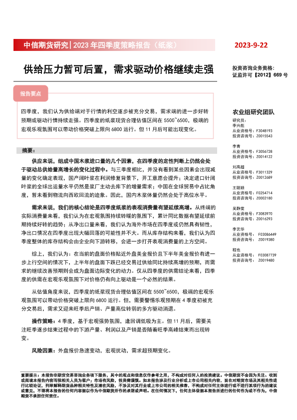 【中信期货】【20230922】2023年四季度策略报告(纸浆):供给压力暂可后置,需求驱动价格继续走强-19页