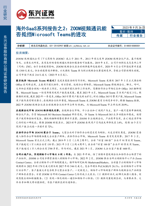 【东兴证券】【20230926】传媒行业海外saas系列报告之2:zoom视频通讯能否抵挡microsoft teams的进攻-18页