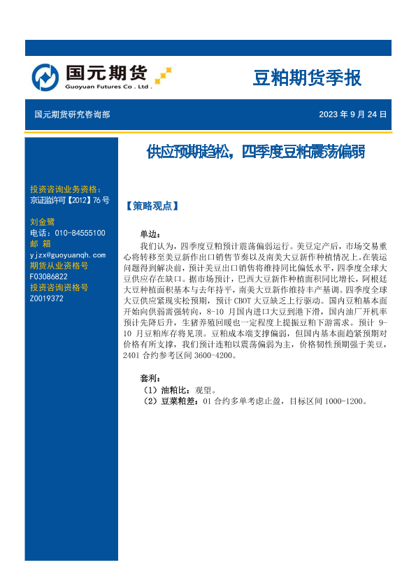 【国元期货】【20230924】豆粕期货季报:供应预期趋松,四季度豆粕震荡偏弱-17页