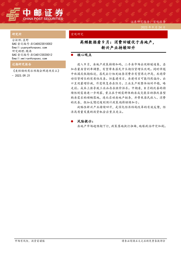 【中邮证券】【20230924】高频数据看9月:消费回暖优于房地产,新兴产业持续回升-37页