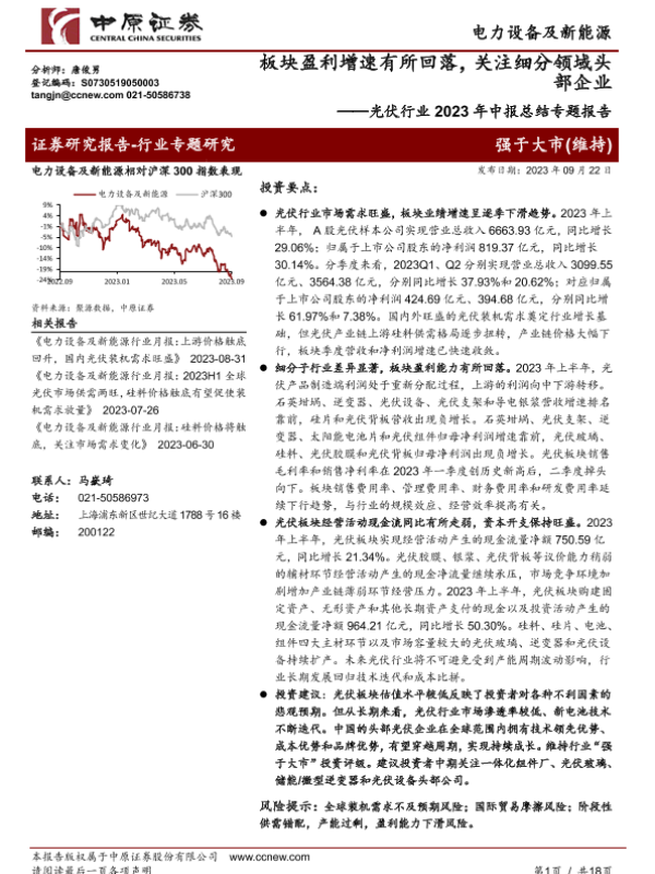 【中原证券】【20230922】光伏行业2023年中报总结专题报告:板块盈利增速有所回落,关注细分领域头部企业-18页