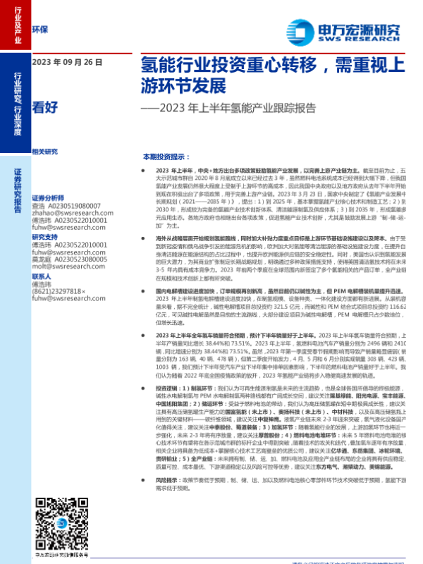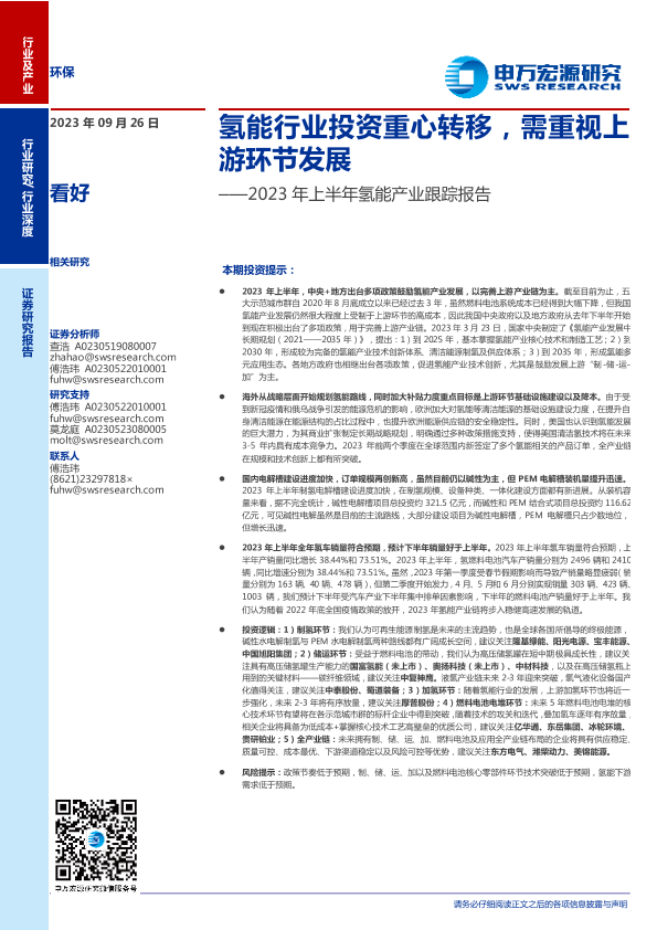 【申万宏源】【20230926】环保行业2023年上半年氢能产业跟踪报告:氢能行业投资重心转移,需重视上游环节发展-37页