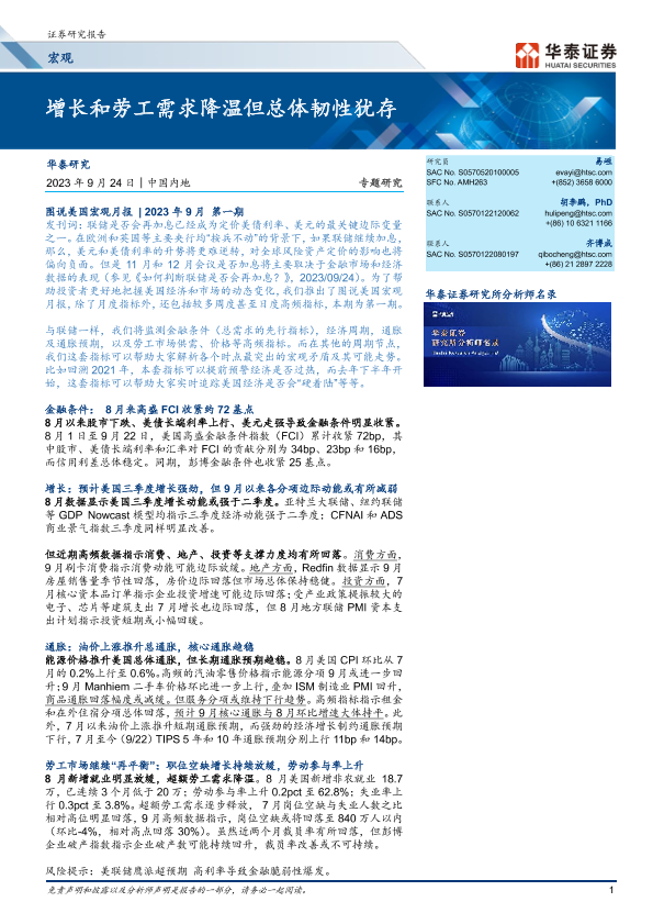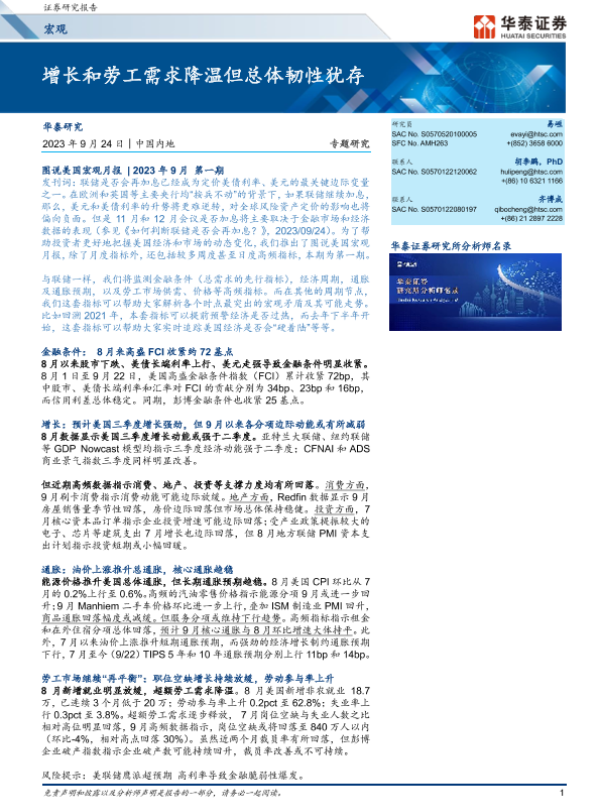 【华泰证券】【20230924】宏观专题研究:增长和劳工需求降温但总体韧性犹存-17页