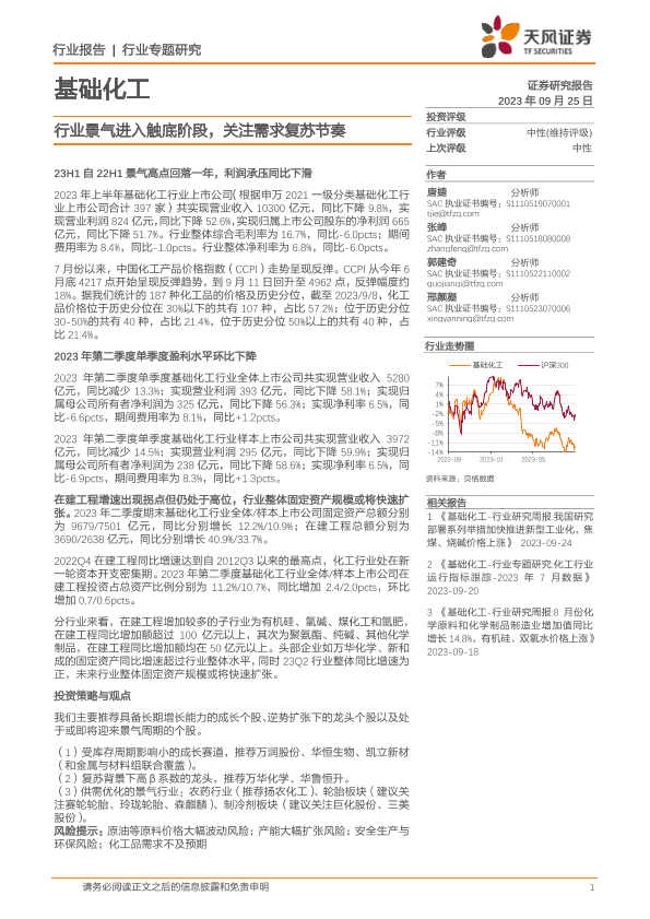 【天风证券】【20230925】基础化工行业:行业景气进入触底阶段,关注需求复苏节奏-23页
