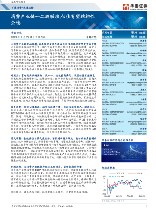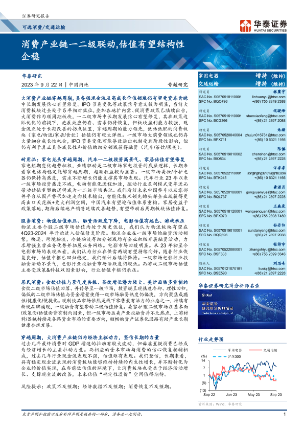 【华泰证券】【20230922】交通运输行业专题研究:消费产业链一二级联动,估值有望结构性企稳-44页
