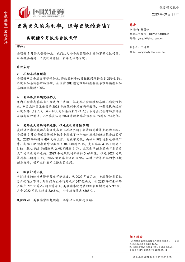 【国联证券】【20230921】美联储9月议息会议点评:更高更久的高利率,但却更软的着陆?-17页