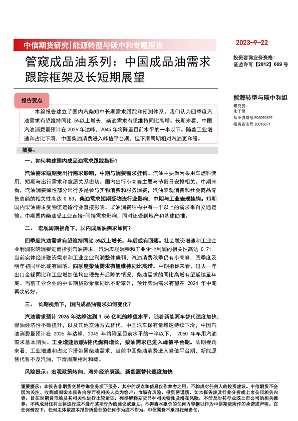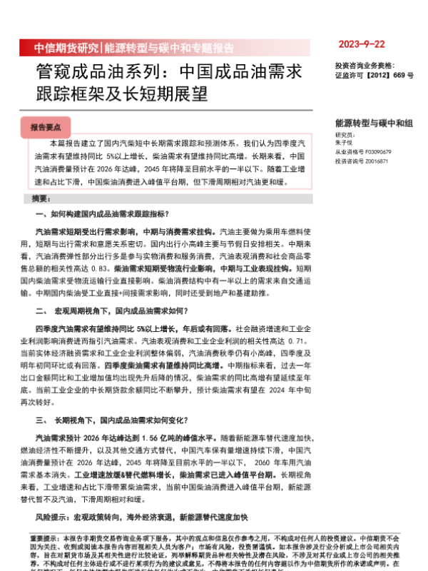 【中信期货】【20230922】能源转型与碳中和专题报告:管窥成品油系列,中国成品油需求跟踪框架及长短期展望-18页