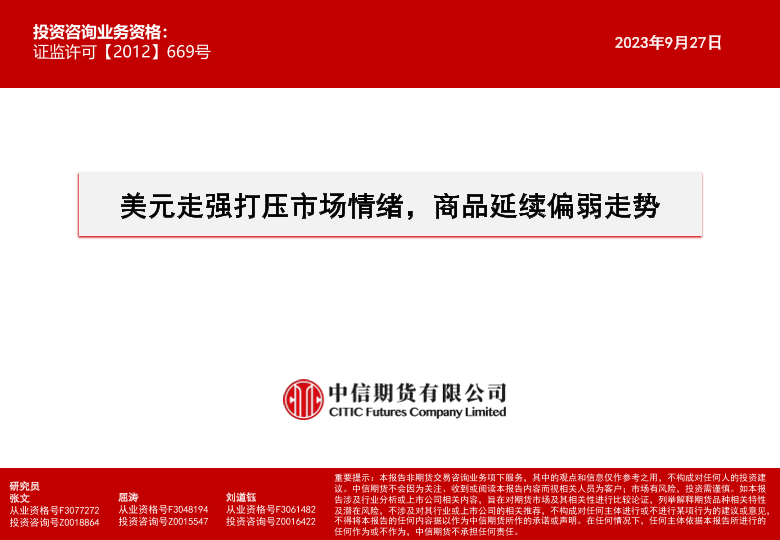 【中信期货】【20230927】美元走强打压市场情绪,商品延续偏弱走势-15页